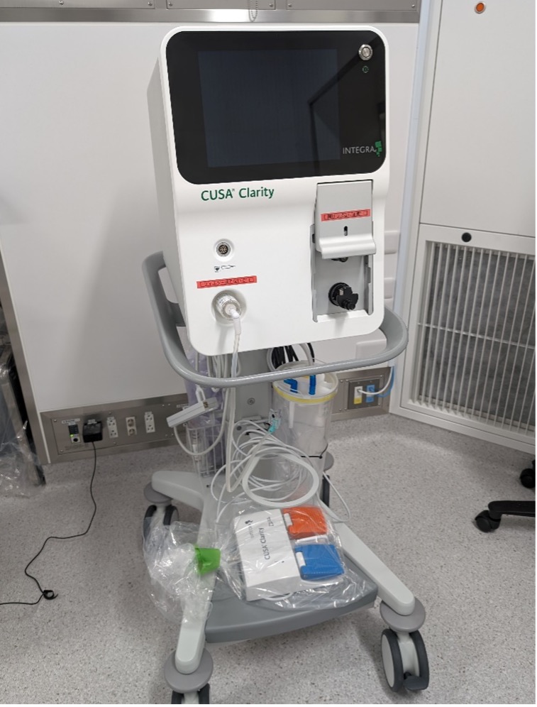 超音波式手術器CUSAのフラッグシップモデルCUSA Clarityを導入しています。本機器は電動式医療用吸引器であり、深部の脳腫瘍摘出の際に最も効果を発揮します。本機はCUSA史上最高の破砕高率とTissue Selectによる研ぎ澄まされた選択制を兼ね備え、重要な血管を温存しつつ効率的に腫瘍の摘出を行うことが可能となります。
